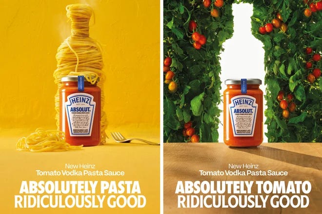 Hat jeder schon die neue Heinz Kampagne gesehen? Geht so: Gigi Hadid teilt irgendwann ihre Vorliebe für ein Tomatensauce-Wodka Rezept 🍸. Zwei Brands springen drauf an, vereinbarten eine Koop und machten nette Poster draus. “Das Produkt” gibt es nur in UK, nur bei Waitrose und wird wahrscheinlich mit fünf per Hand zusammengemixten Einheiten knapp 16 Minuten lang im Handel sein.