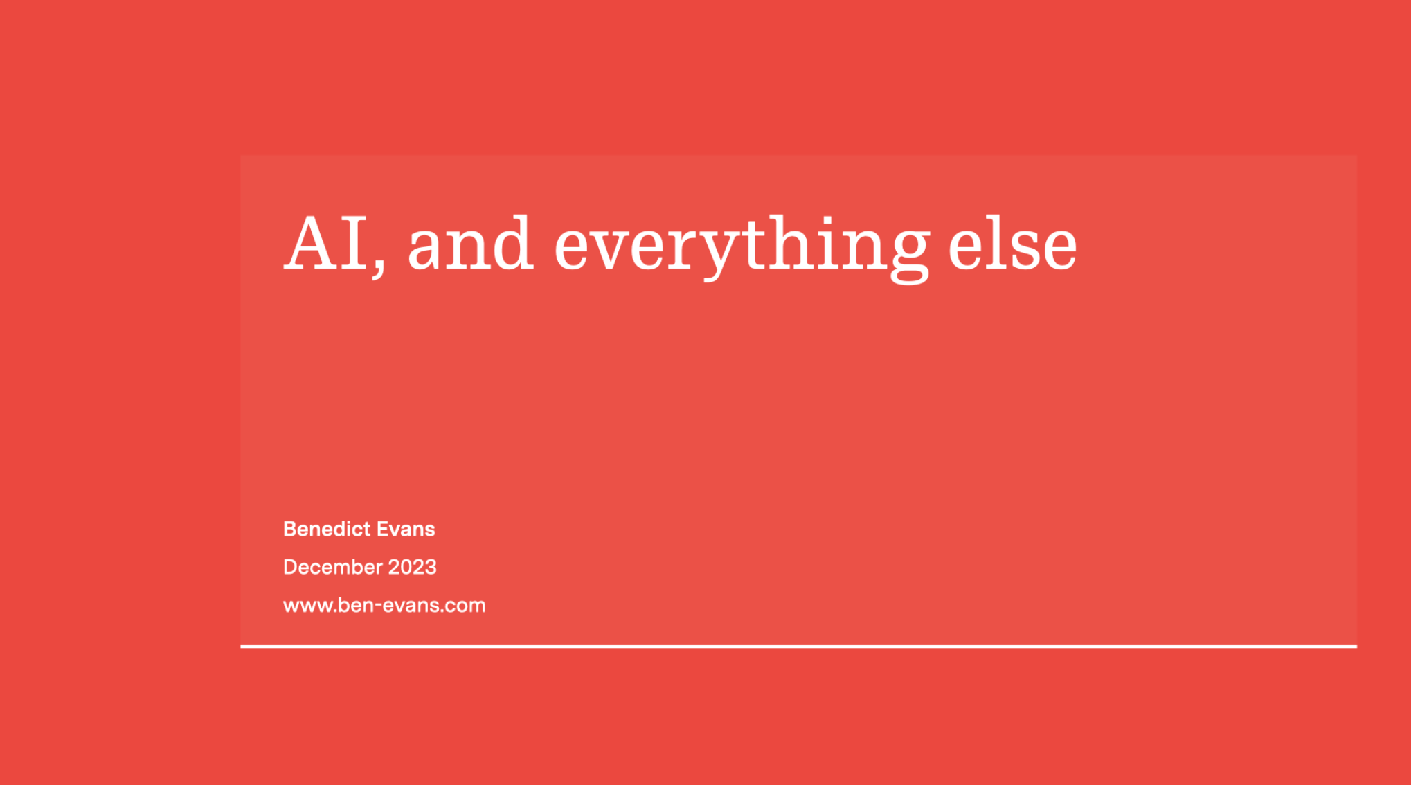 👊 Unter den großen Analyst:innen-Präsentationen ist das jedes Jahr ein ganz besonderes Event: Ben Evans Jahrespräsentation zum “State of the Internet” heißt passend “AI, and everything else” und man sollte sie gelesen haben.