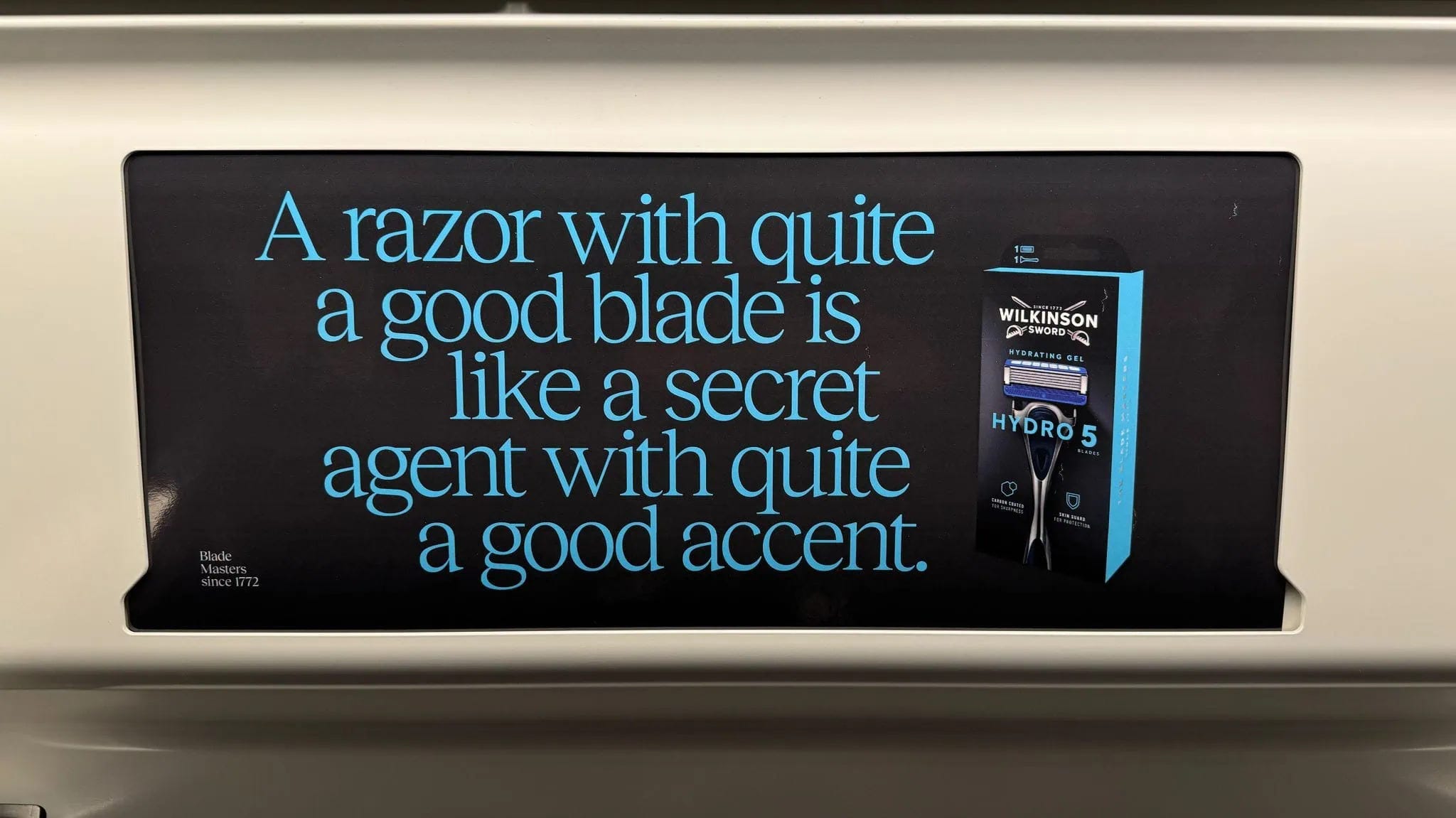 🪒 Ja, die Welt ist ein schrecklicher Ort. Aber eine Sache gibt mir zumindest ein klein wenig Zuversicht: Wir sehen wieder mehr gut getextete Werbung (think Scalable) auf Großflächen und AI ist definitiv nicht dafür verantwortlich sondern Menschen. Besonders schön: Wenn schöne Werbung für Rasierklingen auch nicht mehr sein will als schöne Werbung für Rasierklingen.