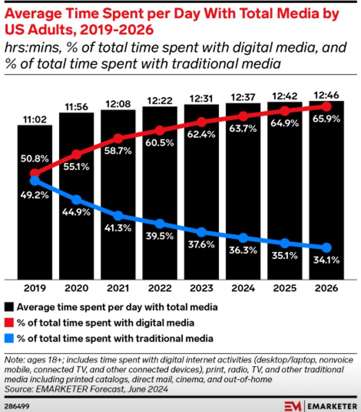 💾 Was 2019 noch 50/50 war, wird 2026 noch 2/3 x 1/3 sein. Es geht um die durchschnittliche US-Mediennutzung. Wie gerne würde ich nochmal auf diese Werberparty 2009 zurück, um diesem CD diese Statistik unter die Nase zu halten, der Digital “Below the Line” nannte. Linear TV is dead, baby.
