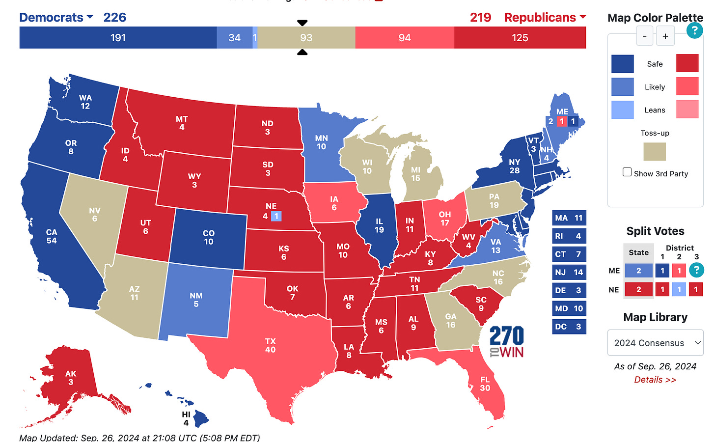 37 Tage bis zu einer Wahl, die auch für uns sehr vieles entscheiden kann (Stichwort Ukraine). Bei allem, was ich sehe, wird auch diese US-Wahl wieder eine Nacht voller Baldriantees, Zähneknirschen und Panikanfälle für mich werden. Die Grafik stammt von 270towin (die Wahlmännerstimmen sind gemeint).