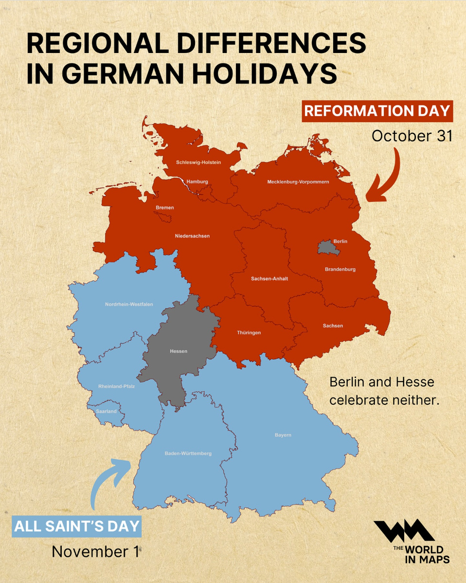 Ich habe am 1. November Geburtstag. Ein Tag, der von Feiertagen im Süden und Norden eingerahmt ist und der deshalb zum Reinfeiern oder Brückentag-Feiern einlädt. Außer man ist Hesse, so wie ich. Dann geht das nicht. Bonuspunkte habe ich immer dafür bekommen, dass ich früher immer im Grenzgebiet zu NRW, Rheinland-Pfalz oder BaWü gelebt habe. Alle um mich herum hatten frei. Ich nicht. Mittlerweile habe ich mich wenigstens zum Reformationstag gerettet.